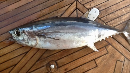 Descripció Cos compacte, lleugerament més curt que la tonyina vermella (bluefin tuna). Boca més petita , amb ulls grans i aleta pectoral notablement més llarga. Colors : fosc en el llom, i en el ventre més platejat. Habitat: En tots els mars tropicals I també d’ aigues templades del planeta.